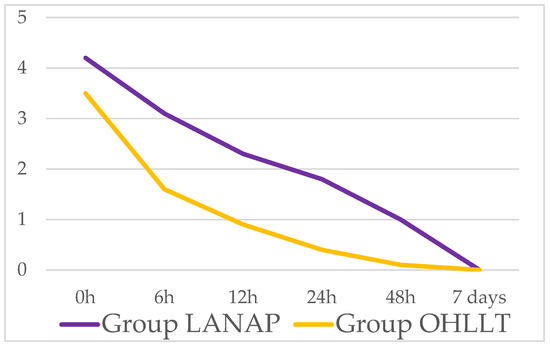 Within the first group, the feeling of pain reached its peak at 0 h following the implementation of the LANAP protocol, with an intermediate score of 4.2. Subsequently, there was a gradual decline in pain perception, resulting in an intermediate score of 3.1 after 6 h and ultimately reaching a score of 0 by day 7 (Table 1; Figure 7).