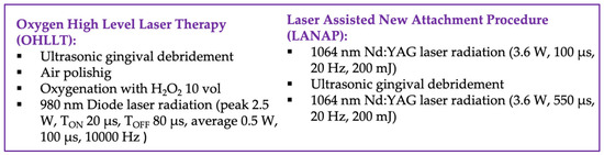 In summary, the microbiological assessment conducted in the previous study by the same authors [30] indicates that both the OHLLT and LANAP protocols exhibit efficacy in the nonsurgical management of periodontal disease. It confirms the susceptibility of periodontopathic bacteria to OHLLT and LANAP protocols. However, it is recommended that further research be undertaken to validate the initial findings regarding the effectiveness of LANAP and OHLLT protocols in the treatment of periodontitis and peri-implantitis, both in nonsurgical and surgical approaches.