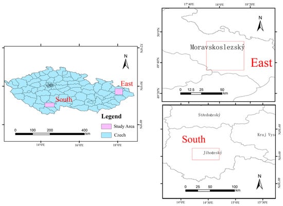 This study selected two experimental areas, namely East and South areas, situated in Czech. Both areas cover all types of land cover, reflecting the overall distribution of land cover in Czech. Moreover, they represent a larger proportion of land cover types with minimal coverage compared to other areas. The spatial relationship between the experimental areas is depicted in Figure 1.