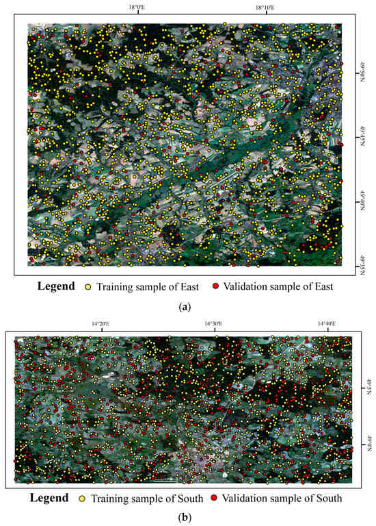 Sample distribution. (a) Sample distribution in the East experimental area; (b) sample distribution in the South experimental area.