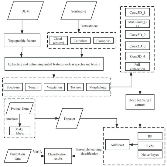 This study utilizes the Google Earth Engine (GEE) platform to obtain Sentinel-2 imagery and digital elevation model (DEM) data, thereby generating a dataset of samples and labels through the intersection of processed product data. Initially, features were extracted from the Sentinel-2 images and DEM data, including spectral bands, vegetation index, and terrain factors. Subsequently, random forest was applied to evaluate feature importance for reducing data dimensionality and selecting high-quality features for classification. Following this, multi-level spatial features and deep semantic information were extracted to improve classification performance, incorporating texture and morphological features. During this process, a pre-constructed dataset of samples and labels was utilized to extract and integrate deep semantic features using a 3D convolutional neural network (3DCNN), resulting in high-quality features with strong discriminative power for subsequent land cover classification. Finally, a classification model was designed to accomplish the ultimate land cover classification, utilizing RF as the base classifier and employing the AdaBoost strategy in ensemble learning. The technical workflow of this study is depicted in Figure 3.
