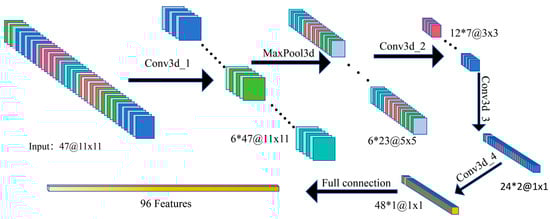 After acquiring various image features, we feed the optimized variables into a convolutional neural network (CNN) for deep feature extraction. Specifically, we use a 3DCNN model built on the PyTorch framework for this task. In Figure 4, Conv3d_1 represents the initial 3D convolutional layer designed to extract primary features from the input data. Padding ensures that the spatial dimensions of the output feature map closely match those of the input to capture boundary information effectively. The MaxPooling layer reduces the spatial dimensions of the feature maps, enhancing features and decreasing computational complexity. Following Conv3d_2, Conv3d_3, and Conv3d_4, continue to extract 96 features. Ultimately, Fc1 transforms the flattened feature map into a 96-dimensional feature set. The network architecture of the 3D CNN is depicted in Figure 4, where a 96-dimensional feature vector is obtained at the fully connected layer and utilized as input for the final classifier.