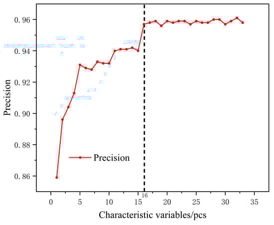 The classification method of random forest was employed in this study to obtain the accuracy curve and feature importance ranking as the number of features varied. The accuracy curve, depicted in Figure 6, illustrates a noticeable upward trend until the number of feature variables reaches 16. Beyond this point, the curve exhibits oscillations, leading to the selection of 17 features as the initial set. The 17 initial features include NDWI_mean, NDWI_max, NDBI_mean, NDTI_max, BSI_stdDev, SAVI_max, NDVI_stdDev, NDVI_max and Band 2, Band 3, Band 4, Band 5, Band 6, Band 7, Band 8, Band 11, and Band 12 in Table 1. Among these, “mean” denotes the average value, “max” represents the maximum value, and “stdDev” indicates the standard deviation. Terrain factors consist of slope, aspect, and elevation.