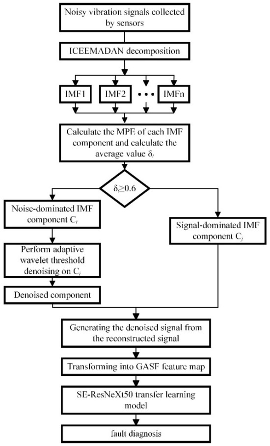 To address the issue of reduced fault recognition accuracy due to the difficulty in extracting fault characteristics caused by a large amount of noise in the signals captured by sensors in complex work environments; first, a denoising method called ICEEMDAN-MPE-AWT was proposed. Then, the noise-dominated IMF components Ci were denoised by using an adaptive wavelet thresholding method. Finally, the denoised noise-dominated components and the undenoised signal-dominated components were reconstructed to obtain the denoised signal. The process of fault diagnosis based on ICEEMDAN-MPE-AWT and SE-ResNeXt50 transfer learning model is illustrated in Figure 1.