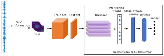 The overall structure of the transfer learning model based on GASF and SE-ResNeXt50 is presented in Figure 3. First, the signal was intercepted by overlapping sampling, and then converted into a unique 2D feature map by GASF transformation. Then the feature map was split up into a training set and a test set, and the data of the training set were enhanced. Finally, the training set and test set were introduced into the SE-ResNeXt50 transfer learning model. The parameters of the SE-ResNeXt50 model used in this paper are demonstrated in Table 1.