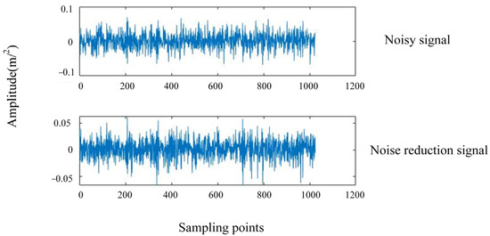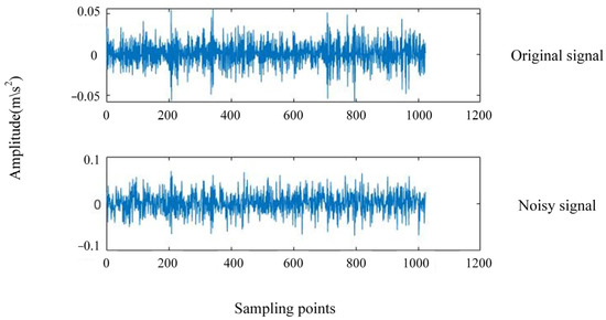 IMF components with an average MPE greater than 0.6 were first denoised by using AWT, and then the denoised IMF components were reconstructed with the undenoised IMF components. Specifically, the denoised IMF1–IMF5 components were reconstructed with IMF6–IMF8 and the residual component, resulting in a denoised signal. Figure 8 illustrates the comparison result compared to the denoised signal and the noised signal. It can be seen that the amplitude of the noised signal is −0.1~0.1; after the noise reduction approach raised in this paper, the amplitude is reduced to −0.05~0.05. Moreover, it can be found from the figure that the signal after noise reduction has more significant fault characteristics, more significant vibration and shock, and a higher coincidence degree with the original signal compared with the signal without noise reduction.