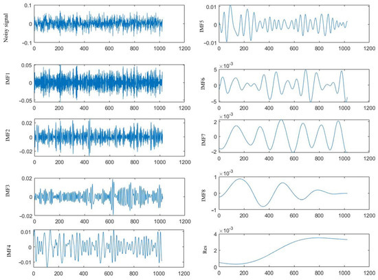 The noise reduction approach presented in this paper was adopted for noise reduction. Firstly, the ICEEMDAN algorithm was used to decompose the noised signal, and the result is presented in Figure 7. As can be found from the figure, after ICEEMDAN decomposition, eight IMF components and one residual component are obtained, respectively. ICEEMDAN successfully decomposed the noised fault signal into high-, medium- and low-frequency components, and each component has different time scales, without obvious mode aliasing. Then, the average MPE of each IMF component was calculated, which is presented in Table 5. As depicted in the table, the average value of IMF1–IMF4 is greater than 0.6, so the adaptive wavelet threshold noise reduction is needed.