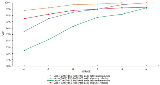 GASF+TSE-ResNeXt50 and GASF+TSE-ResNeXt18 models before and after noise reduction.
