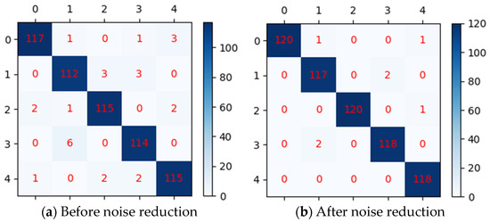 In order to verify the efficacy of the ICEEMDAN-MPE-AWT noise reduction method in improving the fault diagnosis of the model in noisy environments, the experimental dataset with a load of 7.32 Nm was selected, and noise with SNR ranging from −4 dB to 6 dB was introduced to the test set. Then, the precision of the raised method before and after noise reduction was measured and compared to prove the effectiveness of the raised approach. For the sake of checking the generalization of the noise reduction method raised in this paper, the GASF+TSE-ResNeXt50 model and GASF+TSE-ResNeXt18 were selected as the test model for fault diagnosis. The recognition accuracy of the model on the test set was taken as the evaluation index, 10 repeated tests were carried out for each model, and the average value of the 10 tests was seen as the final results. The results are illustrated in Table 6. It can be found from Table 6 that after noise reduction by adopting the approach in this paper, the accuracy of GASF+TSE-ResNeXt50 can still reach 98.8% when the SNR is −4 dB. Therefore, the approach introduced in this paper has better noise reduction efficacy in noisy environments and can ensure the precision of the model. Figure 9 shows the precision curves of the two models before and after noise reduction, which can more intuitively see the effectiveness of ICEEMDAN-MPE-AWT noise reduction method. Figure 10 shows the confusion matrices of GASF+TSE-ResNeXt50 before and after denoising when SNR is −4 dB and the load is 7.32 Nm. The horizontal coordinate represents the true label of the failure, the vertical coordinate represents the predicted category of the failure, and the numbers on the main diagonal of the matrix represent the number of samples correctly classified for each type of failure.