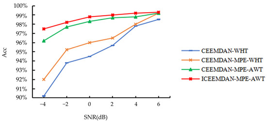 The experimental outcomes are demonstrated in Table 7 and Figure 11. It can be found that ICEEMDAN-MPE-AWT and CEEMDAN-MPE-AWT denoising methods achieved high accuracy; when SNR is 6 dB, both denoising methods can ensure an accuracy of over 99%, and as the SNR decreases, the accuracy decreases less. In addition, ICEEMDAN-MPE-AWT still has an accuracy of 99% when SNR is 2 db, and the accuracy is higher than that of CEEMDAN-MPE-AWT. This shows that ICEEMDAN can better extract the local features and periodic components in the signal than that of CEEMDAN, it acquires the effective information of the signal and obtains more stable and reliable IMF components. Therefore, the combination of ICEMDAN with MPE and AWT has achieved better noise reduction effects and improved the accuracy of the model.