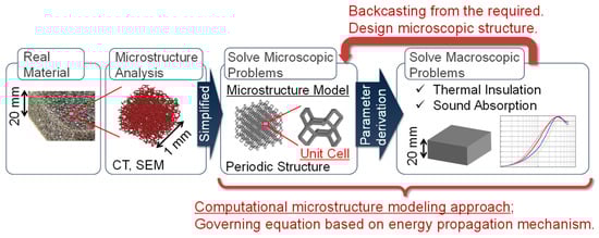 Therefore, we have been working on the research and development of porous materials using materials model-based research through collaboration between industry, the government, and academia. This research method aims to develop materials with favorable performance efficiently by backcasting from the required functions of such products. The phenomena occurring in the internal microstructure of a material are modeled using mathematical formulas based on the energy propagation mechanism, and the product is designed based on the modeling results. We have developed a computational microstructure modeling approach that predicts three properties of porous materials: sound absorption, thermal insulation, and vibration damping (Figure 1) []. Vibration damping is an important property that affects the ride and feel of a vehicle, but it is not the subject of this study.