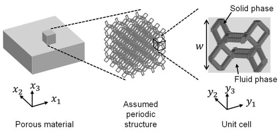 Assuming that the microstructure is periodic, let be the unit cell and be the size of the unit cell ( in Figure 2). The representative macroscale length is the wavelength of the porous material, and the ratio of the representative microscale length to the representative macroscale length is . Let be the macroscale spatial variable and be the microscale spatial variable. Asymptotic expansion solutions are possible; Gilbert and Mikelić [] and Clopeau et al. [] applied two-scale convergence theory to a problem of porous materials. For the state quantities , , , , and , we assume the asymptotic expansion solution of Sanchez-Palencia [] as follows: