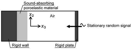 The normal-incidence sound absorption coefficient is derived through Equation (21) using the acoustic tube model shown in Figure 3 and by formulating the porous sound-absorbing material using the homogenized macroscopic properties (, , , , , and ) and the macroscale governing equations (Equations (17) and (18)):
