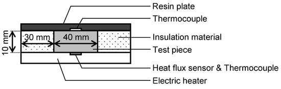 Thermal conductivity was measured in a room under standard conditions using a simple measurement apparatus equipped with a heat flux sensor, thermocouples, an electric heater, and a thermal insulator, as shown in Figure 5. The heat flux sensor and a thermocouple were placed on the heater, which supplied a constant heat quantity. The test specimen, which was covered with an insulation material with a thermal conductivity of 0.0313 W/(m·K), was placed on the heater and the thermocouple, and a thermocouple and a 1 mm-thick resin plate was placed on the test specimen for measurement. Thermal conductivity was derived from the measured heat flux and the temperatures above and below the specimen. Since this measurement apparatus is a simplified system, heat flow leaks out of the system. The thermal conductivity of the thermal-insulating material was 0.0313 W/(m·K) according to a steady-state thermal conductivity measurement system (HFM436/3/1 Lambda, NETZSCH-Gerätebau GmbH, Selb, Germany; per JIS A 1412-2 [] and ISO 8301 []) and 0.0469 W/(m·K) according to this simple measurement apparatus. Therefore, as a reference value, a calibrated value of thermal conductivity was also calculated, assuming a constant percentage of heat flowing out of this simple system to measure thermal conductivity.