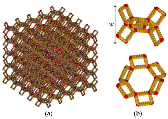 In this study, we made the solid phase vibrate violently due to incident sound waves to induce relative velocity and viscous damping at the boundary between the fluid and solid phases as a sound absorption mechanism without sound wave penetration, which is unlike the conventional method shown in Section 2.2. The main result of this verification is the goal of this study. The normal-incidence sound absorption coefficient was calculated using the model shown in Section 2.1 to verify the abovementioned concept. The Kelvin cell model in Figure 6 was used to represent the microstructure of the porous sound-absorbing material. Its unit cell (Figure 6b) consisted of a rectangle and a hexagon with bar-like ligaments. Given the same lengths of the three sides of the unit cell (), the sizes of the square and hexagonal vacancies were approximately 1/3 and 2/3, respectively. The lengths of the three sides of the unit cell were varied from 1 to 10 μm (the average pore size was approximately 0.5–5.2 μm), which are almost impenetrable to sound waves. The material of the ligaments was glass, and the material properties of the joints between ligaments were set, as shown in Table 1.