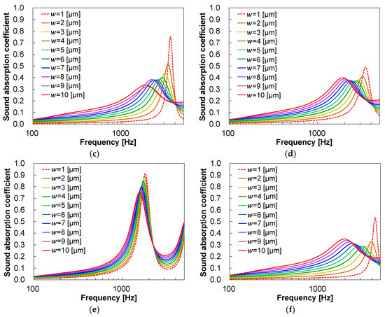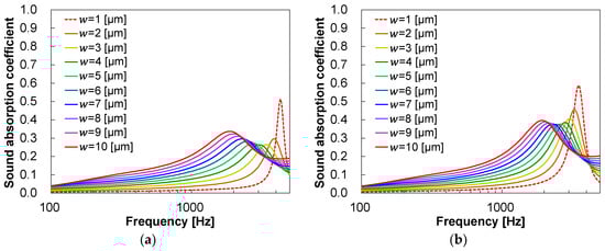 In the sound absorption coefficient spectra of both glass (Figure 7a) and rubber 1 (Figure 7b), the peak shifts to the higher-frequency side and narrows as decreases. This peak shift is caused by the resonance frequency of the ligaments shifting to the higher-frequency side as reduces and the bar-like ligaments become thinner and lighter. The narrowing of the peak is caused by a decrease in the number of sound waves penetrating the sound absorber, which reduces the contribution of viscous damping and heat dissipation due to air vibration and increases the contribution of viscoelastic damping and viscous damping due to the resonance of the sound absorber. Moreover, the sound absorption coefficient peaks are higher for all values when the bonding points between the ligaments have rubber-like material properties. This may be due to (1) an increase in viscoelastic damping caused by the distortion of the rubber at the joint or (2) an increase in viscous damping caused by an increase in the resonance amplitude of the ligament due to a smaller ratio of the spring constant at the joint to the ligament weight. The results were compared by varying only the loss factor or Young’s modulus at the joint to determine the cause.