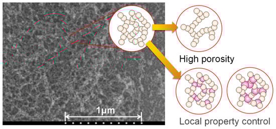 Another typical property that arises from a porous structure is thermal conductivity. A high-performance porous thermal insulator generally has a mixed structure comprising a solid phase as its base material and a fluid phase consisting of independent spaces with diameters ranging from several tens of nanometers to several tens of micrometers; its thermal insulation properties also depend on its microstructure [,,]. Thus, porous sound absorbers and porous thermal insulators are similar; they differ in the microstructures they offer for high performance, specifically the size and connectivity of their fluid phases. The difference in the size scale of the fluid phase makes it difficult to achieve compatibility between the two materials at high dimensions.