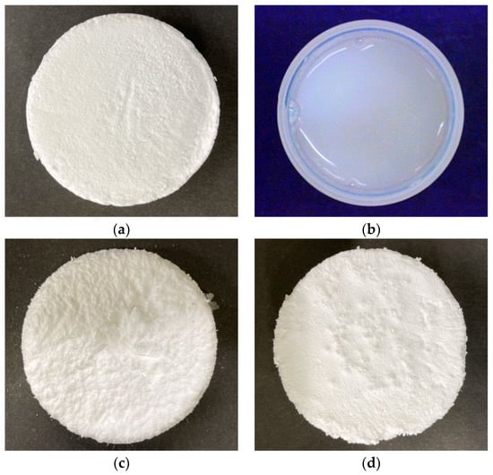The appearance of the produced PMS xerogels is shown in Figure 9. The original PMS xerogel (Figure 9a) was synthesized as a homogeneous dry gel. Its porosity, calculated using the bulk and skeletal densities, was 89.5%. The aged and diluted PMS xerogel (Figure 9b), in which the amount of alkoxysilane precursors was decreased to half its volume to increase its porosity, did not form a gel structure after aging; it remained in solution form. The CNF–PMS xerogel composite (Figure 9c), in which the amount of alkoxysilane precursors was also decreased to half its volume, was synthesized as a dry gel. However, it was mechanically weak, and its surface was damaged when something came in contact with the specimen. Its porosity was 94.2%. The hydrophobic CNF–PMS xerogel composite (Figure 9d) was a tougher dry gel than the CNF–PMS xerogel composite. Its porosity was 93.2%. A moderate interaction or inter-dispersion was observed between the sol framework and CNFs, and the toughness of the gel depended on the balance between them.