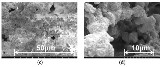 SEM images of the original PMS xerogel and the hydrophobic CNF–PMS xerogel composite are shown in Figure 10. In the original PMS xerogel, gel particles with diameters of several micrometers are strung together to form the three-dimensional porous structure. The hydrophobic CNF–PMS xerogel composite comprises gel particles with a broad size distribution (diameters ranging from several hundred nanometers to several micrometers). No fibrous structures are observed. The CNF is the substance that adheres to the periphery of the gel particles to the extent that it covers the particle shape of the gel particles (Figure 10d). The hydrophobic CNF–PMS xerogel composite has a higher porosity than the original PMS xerogel, suggesting that the CNFs also function as binders. The CNFs are sparsely distributed, indicating that gel particles are exposed in places. As shown in Kobayashi et al. [], it can be inferred that gel particles coated with C-C bond-dominated CNFs exhibit a higher modulus than the exposed gel particles.