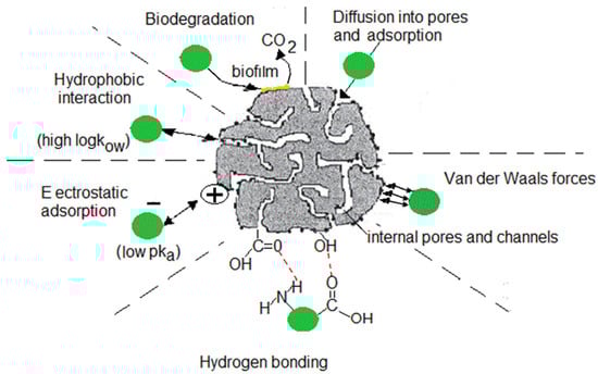 Possible mechanisms of PFAS adsorption. (Green colour = PFAS; large porous ball in the centre = adsorbent) (modified from [36]).