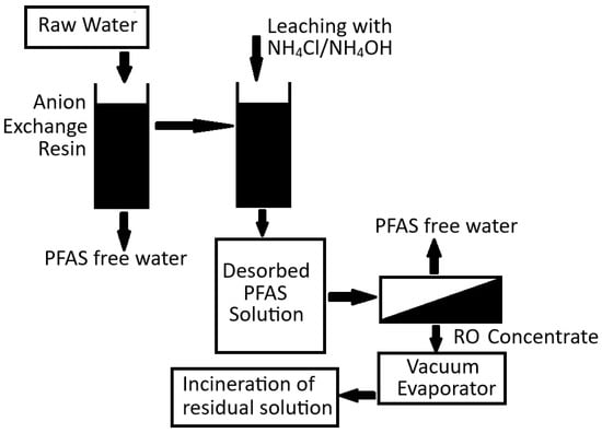 Use of anion exchange resins followed by reverse osmosis (RO) vacuum evaporation and incineration to remove PFAS (modified from [38]).