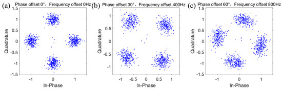 The offset interference received by the signal in the channel mainly includes frequency offset and phase offset. Different signals contain different frequency components, and different arrival times will lead to a phase offset. Frequency deviation between transmitter and receiver and instability of frequency oscillator result in frequency offset. The constellation diagram of QPSK signal makes it easy to observe changes directly. Select a group of constellation diagrams of the signal at 18 dB to see the impact of frequency offset and phase offset on the signal. It can be seen from Figure 1 that when the signal is not affected, it is correctly represented on the constellation diagram. When the phase offset is 30° and the frequency offset is 400 Hz, the rotation dispersion changes obviously; when the phase offset is 60° and the frequency offset is 800 Hz, the changes in the constellation diagram are more obvious. The above changes can be approximately summarized as offset, rotation, and scaling.