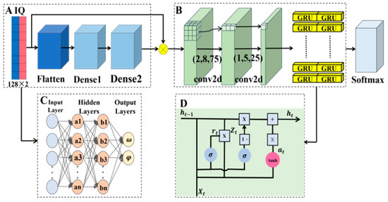 CNN, two GRUs, and a thick layer that supports feature extraction and classification make up Part B. The signal’s spatial features are retrieved by the first convolution layer, which has 75 filters and a 2 × 8 kernel size. The extracted features are then further compressed by the second convolution layer, which has 25 filters and a 1 × 5 kernel size. The temporal characteristics of the signal are extracted using the following GRU layers using 40 units. Ultimately, the dense layer—which has the same number of modulation classes—completes the classification assignment. Repaired linear unit activation functions are used in the first two convolution layers, On the other hand, the final thick layer uses Softmax. In order to produce a model that is smaller and requires less computing power, the matching network in the third part is designed to control the model size using a restricted number of parameters in the CNN layers.