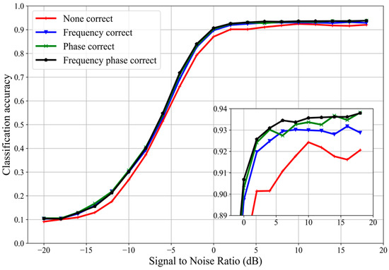 Further tests were carried out that produced definitive findings, even if it was a typical series of experiments to identify beneficial architectures and hyperparameter settings. We performed a contrast experiment to confirm the efficacy of phase and frequency correction in order to compare the efficiency of the suggested strategy. Four sets of comparison experiments were conducted, which were no correction, single frequency correction, single phase correction, and proposed frequency and phase correction method. The effect of frequency offset included the effect of phase offset. Figure 4 shows that the proposed method has better performance in recognition accuracy than the other three comparative experimental methods.