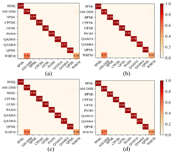 Confusion graph of ten modulation signals in 10 dB SNR with different correction methods. (a) No correction module; (b) Frequency correction module; (c) Phase correction module; (d) Frequency and phase correction module.