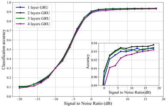 In the part before, an effective structure based on a two-layer GRU network was suggested; an experiment was then carried out to confirm it. First, set up a comparison experiment with different numbers of GRU layers: 1 layer, 2 layers, 3 layers, and 4 layers. Figure 6 indicates the performance of 2-layer GRU is better than the others. There is a little difference between the 3-layer GRU and 1-layer GRU in recognition accuracy, and 4-layer GRU is not as good as the other three groups due to overfitting.