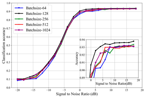 The detailed parameter comparison between the proposed model and the eight common signal modulation recognition network models shows that the parameter number of the proposed model is nearly 50% less than that of the CGDNN model with the least parameters, and nearly 98% less than that of the DENSNET model with the most parameters. This model has greater average and maximum accuracy than the other eight models that are currently in use. In order to attain the maximum recognition accuracy rate, the experiment expanded the number of training groups. Figure 10 shows that fewer groups are already able to attain the current acceptable recognition accuracy. The reduction of parameters can reduce training costs and improve training efficiency for future research. Other performance parameters are listed in Table 2.