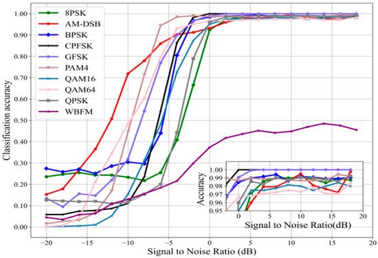 Figure 10 displayed the identification accuracy of 10 modulation signals under different SNRs. The maximum recognition accuracy was 93.79% when the SNR was at 18 dB. All signals except WBFM were properly detected, and the recognition accuracy was above 97% when the SNR was greater than 5 dB. The average recognition accuracy was higher than 90% when the SNR was greater than 0 dB. The difficulty is exacerbated by the fact that the WBFM signal in the dataset is produced by sampling analog audio sources, and there are silence cycles. The greatest recognition performance, the strongest anti-interference capacity against noise, and 100% accurate identification were all exhibited by GFSK and CPFSK. The outcome suggests that the technique may be applied for more accurate modulation recognition.