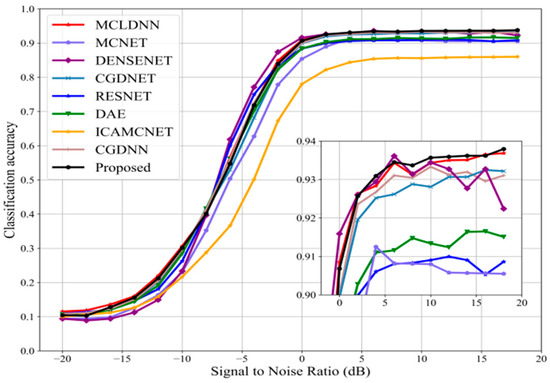Furthermore, the network model presented in this research was sufficiently extended to be used for the problem of modulated signal identification. We conducted a comparison between the suggested strategy and eight popular network frameworks in order to determine its effectiveness. All of the aforementioned classifications made use of the RadioML2016.10b datasets and were balanced. The majority of the suggested method’s recognition accuracy rates display a leading level, as seen in Figure 11. The recognition accuracy rate has been consistently higher than 93% when SNR is higher than 5 dB. In comparison to other models, the DAE, RESNET, and MCNET models have poorer recognition accuracy. At 6 dB, DENSENET has the highest recognition rate of all the comparison models; however, at greater SNR, the recognition accuracy keeps decreasing. This is because the model has a lot of parameters, which leads to overfitting and lowers recognition accuracy. The model presented in this paper shows good performance at all signal-to-noise ratios.