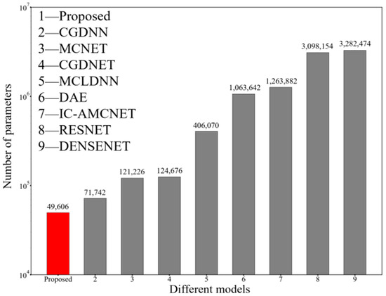 Similarly, as a lightweight index, Figure 12 shows that the proposed method uses the minimum parameter compared with the reported methods, and thus can decrease computational complexity 50% or more. This shows that the proposed method increases more training groups to improve high classification accuracy, and average recognition accuracy is also at a high level.