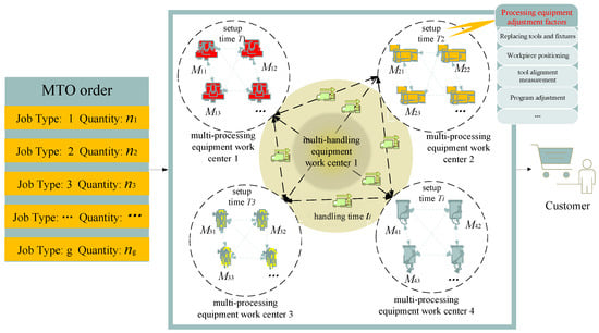 With the intensification of market competition and the acceleration of product updates, the modern manufacturing industry is facing challenges such as single-piece, small-batch, and personalized production []. In order to adapt to market changes, companies need to quickly adjust workshop layout and production plans to meet demand []. Therefore, the production mode of make-to-order (MTO) with multi-variety and small-batch demand is increasingly popular, and flexible job shop scheduling has become the focus of current research, especially for intelligent manufacturing systems with MTO requirements. The production systems of MTO with multi-variety and small-batch demand often employ multi-equipment work centers to maintain process flexibility and separate operation time for fine management. These are difficult and complicated to schedule and optimize for the production system with multi-equipment work centers due to external factors such as the various types of products ordered by customers, small batches, short lead times, and internal factors such as limited production resources. The scheduling problem of the production system with multi-equipment work centers introduces two different types of work centers, the processing equipment work center and the handling work center, and configures multiple pieces of processing equipment and handling equipment with the same function for them, respectively, so as to complete the production tasks of the MTO system faster and more efficiently to adapt to changes in market demand. This kind of problem is an extension problem based on the FJSP, and it is also an NP-hard problem. Therefore, it can be extended on the basis of the FJSP, using the advantages of multi-equipment work centers and the mutual cooperation and resource sharing in each multi-equipment work center to adapt to the production needs of different products or orders, so as to improve the response speed and flexibility of the MTO system.