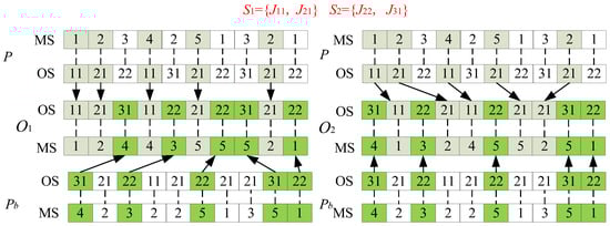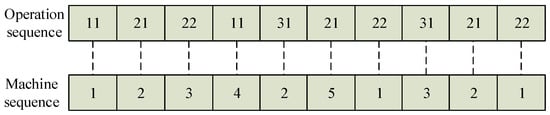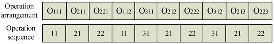 As encoding and decoding involve two aspects of process arrangement and machine selection, the two-layer coding method of process and machine is adopted here, and the length of the coding in the process layer and the machine layer is equal, while the positions are one-to-one. Table 3 shows an example of the FJSP. The first number, 111, in the operation column represents the first operation of the first job in the first type, namely , the second number, 112, represents the second operation of the first job in the first type, namely , the third number, 211, represents the first operation of the first job in the second type, namely , and so on. Therefore, the operation code uses the type of job number in the operation arrangement, and the number of occurrences indicates the processing sequence of the job operation. As shown in Figure 2, if an operation is arranged as , its operation code can be expressed as .
