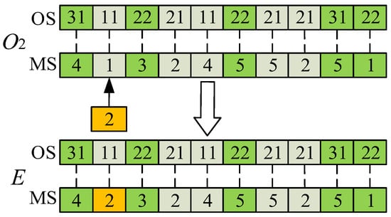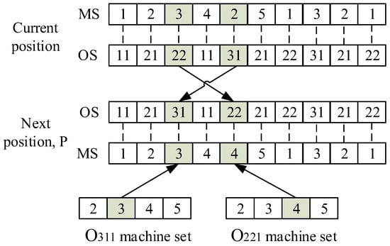The operator represents the inertial motion of particles affected by the current position, which is reflected in DPSO as particle mutation. The specific mutation operation method is as follows: exchange two position elements randomly in the OS sequence of particles, and adjust the corresponding machine according to the sequence of each process after the exchange; at the corresponding adjustment position in the MS sequence, randomly select a machine from the set of optional machines for its operation to be replaced. The operator is shown in Figure 4.