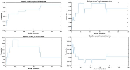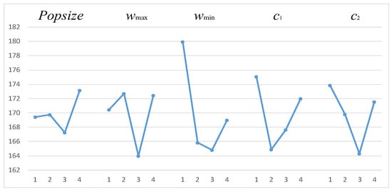 As shown in Table 4, according to extreme values and ANOVA of parametric orthogonal experiments, the influence degree of five factors on algorithm performance is wmin > c1 > c2 > wmax > Popsize. The ki (i = 1, 2, 3, 4) value represents the average of the four experimental results for this parameter at the corresponding i level. As the mean value of makespan is selected as the evaluation index, the smaller the mean value of makespan, the better the running result of the current example. Therefore, the smallest ki value of the parameter corresponding to each column indicates that the i level parameter corresponding to this factor has a better value. As can be seen in Figure 8, the optimal parameters of the algorithm in this paper are set as Popsize = 300, wmax = 0.9, wmin = 0.4 and c1 = 0.7, c2 = 0.9. Other parameters are set as follows: maximum number of iterations: T = 100.