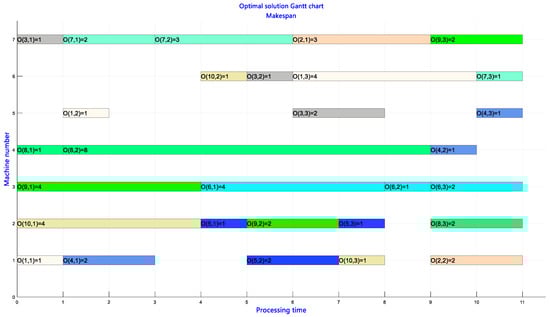In order to enhance the stability and reliability of the experimental results, 30 repeated experiments were conducted to mitigate the influence of random factors and improve the accuracy and reproducibility of the experiment. Meanwhile, to verify the effectiveness of the proposed mathematical model, the IBM ILOG CPLEX 12.9.0 solver was utilized to solve exactly 15 FJSP test instances. During the solving process, the maximum computation time for CPLEX was set to 3600 s, and the exact solutions found within the specified time limit were used as reference solutions. The test results of the 15 instances are shown in Table 5, in which [] the known optimal solution, BKS, of each example is obtained from the literature, tB is the optimal value of the completion time in the 20 solution experiment results of the example, ta is the average value of the 20 solution experiment results of the example, and tav is the average calculation solution time of the tB value.