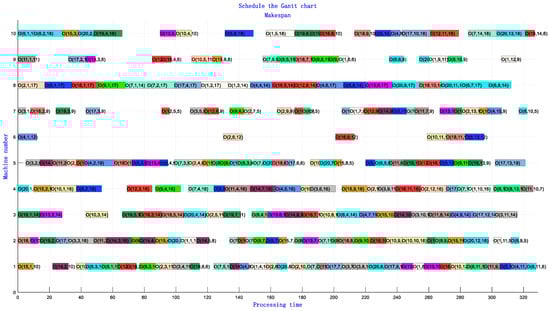 From Table 5, it can be observed that CPLEX is able to obtain known optimal solutions for small-scale instances (Kacem01–03; MK01–02). However, for larger instances, it fails to reach the optimal solution within the given time limit. Additionally, the algorithm in this paper can obtain the best result when the scale of the example is small. The optimal scheduling Gantt charts for Kacem01 and Kacem03 solved by the algorithm in this article are shown in Figure 9 and Figure 10, respectively. Because this paper is based on a multi-objective mathematical model, when the scale of the example is large, the optimal result obtained is inferior to the optimal solution of the known single-objective model. Figure 11 shows the Gantt chart of the optimal makespan of 327 for the larger-scale instance, MK09, solved by the algorithm in this article. However, in all the examples, the average value of the optimal solution of 30 experiments can smoothly approach the optimal result, which shows the effectiveness and reliability of the IDPSO algorithm.