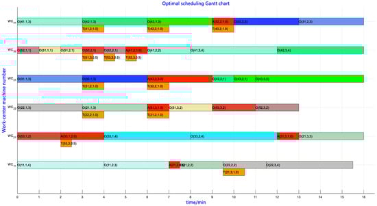 As shown in Figure 12, with the increasing number of iterations, each scheduling objective is continuously optimized, and has good convergence; that is, the maximum completion time, the amount of machine downtime, the number of job handling times and the total load of the machine are constantly optimized, and they are nearly stable after 190 iterations. According to the Pareto optimal solution set and gbest selection strategy in this paper, the job completion time is taken as the first priority of Pareto selection, and the fitness of other objectives evolves with the fitness of the job completion time. Therefore, it is reasonable that the fitness of other targets may decrease suddenly. The resulting optimal scheduling Gantt chart is shown in Figure 13, where the minimum maximum completion time is 16 min, the total number of machine adjustments is 7, the number of job handling times is 12 and the minimum total machine load is 83 min. In Figure 13, “O” in O (11, 1, 4) represents the processing procedure of the job, “11” represents the first piece of the first type of the job, “1” represents the first process of the job, and “4” represents the processing time of the processing procedure on the equipment; in A (21, 3, 1), “A” refers to the adjustment process of the job before the process to be processed, “21” refers to the first piece of the second job, “3” refers to the third process of the job, and “1” refers to the setup time of the processing process on the equipment; in T (21, 2, 1), “T” refers to the handling process of the job before the process to be processed, “21” refers to the first piece of the second type of the job, “2” refers to the second process of the job, and “1” refers to the job handling time on different work center equipment.