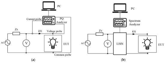 In all cases, the examined object is supplied with sinusoidal voltage from the KIKUSUI PCR 500LA generator. To conduct measurements up to 2 kHz, the class A PQ analyzer FLUKE 435 (with the implemented method of spectrum determination following EN61000-4-7 standard [17]) is used, including the associated equipment such as 5 A precision current clamps Fluke I5s. The obtained data are analyzed using the manufacturer’s PC software (V3.34.1). For sufficient representation of spectra above the harmonic range, EN61000-4-7 standard [17] suggests including a network impedance between the power source and EUT, such as a line impedance stabilizing network (LISN). The measurements at the output terminals of the LISN Rohde & Schwarz HM6050-2 artificial network are made using the Tektronix RSA306B spectrum analyzer. The obtained data are analyzed using specialized software dedicated to the PC, the Tektronix manufactured software SignalVu-PC (V4.1.0022). Detailed information about the spectrum analyzer and dedicated PC software can be found on the manufacturer’s website [55].