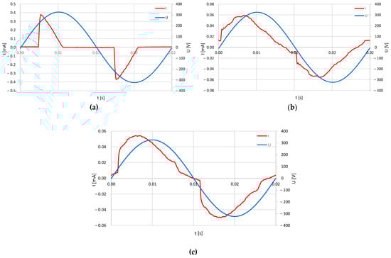 Current waveform (red) under nominal voltage supply (blue) for investigated lighting equipment: (a) CFL 20 W lamp; (b) LED 7 W lamp; (c) LED 8 W lamp.