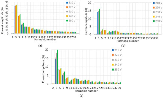 Figure 3a shows the harmonic spectrum for the CFL 20 W lamp with no-PFC topology (PF = 0.6). It consists mainly of third, fifth and seventh harmonics, circa 80%, 50% and 25%, respectively, (in comparison to the fundamental harmonic of 100%). For the lower frequencies (up to 650 Hz), the voltage level variation within the range of 210–250 V with a step of 10 V observable impacts the level of emission. With increasing supply voltage, harmonic current emission becomes more severe. The exception is the 9th harmonic component, for which voltage variation does not influence the amplitude change. The level of successive odd harmonics above 650 Hz (13th harmonic component) decreases to finally reach circa 5% of the fundamental component for the 40th harmonic in 50 Hz systems.