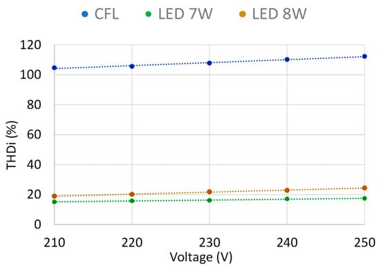 The numerical indicator () of harmonic current emission injected into the power grid by the connected individually lighting devises implies that the overall level of harmonic currents is influenced by a ±10% variation of supply voltage. A small change is noticed for CFL 20 W, the THD varies from −2.9% to 4.1%. For LED 7 W the change is moderate (−6.2% to 8%) and for LED 8 W the change varies between −13.3% and 11.9% which is noticeable. For the selected LED 8 W lamp the maximum relative emission change is higher circa 12% compared to the emission generated by the same device supplied with the nominal voltage level. These statements are illustrated numerically in Table 2, and graphically in Figure 4.