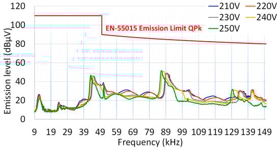 Figure 7 shows the conducted emission in the frequency spectrum within 9–150 kHz generated by the LED 7 W lamp equipped with passive-PFC topology (PF = 0.85). This kind of lamp is constructed with a basic energy supply, accompanied by series capacitors or inductors, which are positioned either before or after the bridge diode rectifier, in order to increase the power factor PF (usually falling between 0.6 ≤ PF ≤ 0.9) [56].