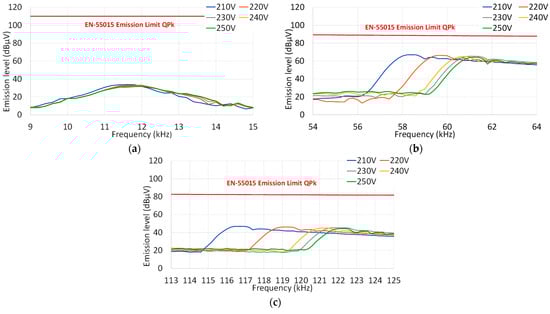Figure 8 zooms in on the dominant bands of the tested LED 7 W lamp. For the EUT, a decrease in the value of the supply voltage causes a shift of the frequency domain band towards lower values. In comparison, an increase in supply voltage causes a shift of the frequency domain band towards higher values (Figure 8b). The highest observed disturbance produced by EUT supplied with 230V equals 52.56 dBµV at 78 kHz bandwidth. The obtained results do not exceed the permissible limits specified in EN55015 standard [21]. The change in the supply voltage level does not significantly affect the emission amplitude change at higher frequencies, i.e., from 84 kHz to 150 kHz.