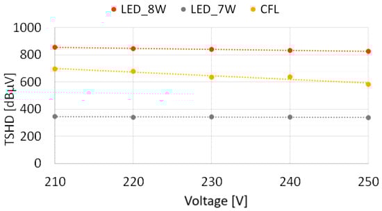 The TSHD factor presents the entire supraharmonic emission in dBµV emitted by a EUT (Table 6). The tested lighting sources are supplied with varying voltage levels from 210 V to 250 V. The results show that the voltage level variation within the permissible tolerance ±10% according to the standard EN50160 [14] affects the TSHD factor. Contrary to harmonic emissions, the severity of supraharmonic emissions (in examined frequency ranges) increases for all EUT with the decreasing supply voltage level value from 230 V to 210 V. The maximum relative emission change is high circa 9.5% for the CFL lighting source supplied with the voltage 210 V compared to the emission generated by the same device supplied with the nominal voltage level.