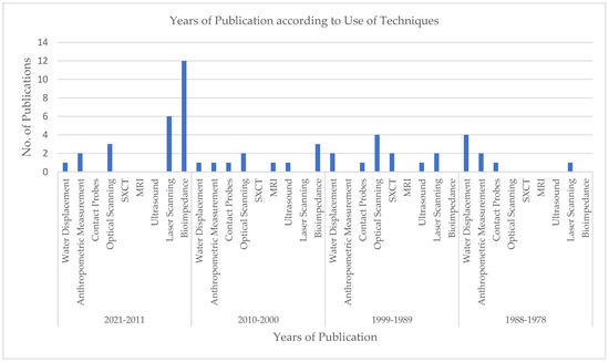 Based on the findings in the publications from the past 10 years (2021–2011) (Figure 2), there were a high number of publications for the bioimpedance (n = 12) and laser scanning (n = 6) techniques compared to the other techniques, namely water displacement (n = 1), anthropometric measurement (n = 2), and optical scanning (n = 3). Also, there were no publications on the contact probe, SXCT, MRI, or ultrasound techniques for the past 10 years. According to the study by the authors, Sanders wrote a significant number of articles on bioimpedance techniques (10 out of 15 publications), even though laser scanning techniques garnered greater attention from different scholars. There were more scholarly publications, which increased the variety of study designs that were used in laser scanning techniques. In addition, from the analysis, the authors also discovered that the water displacement, anthropometric measurement, optical scanning, laser scanning, and bioimpedance techniques were still practical to use, as all the techniques were still being used by many researchers for the past three consecutive decades.