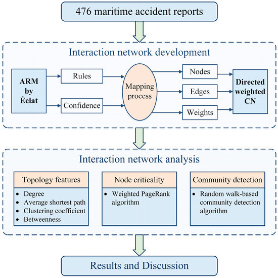 The process of risk interaction analysis based on AR-CN is shown in Figure 1. The risk interaction network is constructed by introducing association rules into complex network. Specifically, the association rules are decomposed into nodes and edges of the network, and the confidence value of the rules represents the weight of the edges. The detailed process is described in Section 3.3.1. Then, the risk evolution characteristics of seafarers’ unsafe acts are systematically analyzed based on the complex network theory from three perspectives: topology feature, node criticality, and community detection.